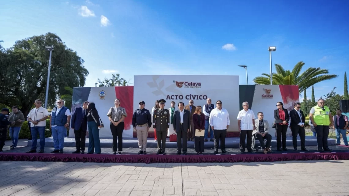Celaya, Gto., a 13 de septiembre del 2025.- Autoridades civiles y militares conmemoraron el 178 aniversario de la Defensa del Castillo de Chapultepec con un acto cívico-militar al pie de la mega bandera en la explanada del Parque Xochipilli, segunda sección.