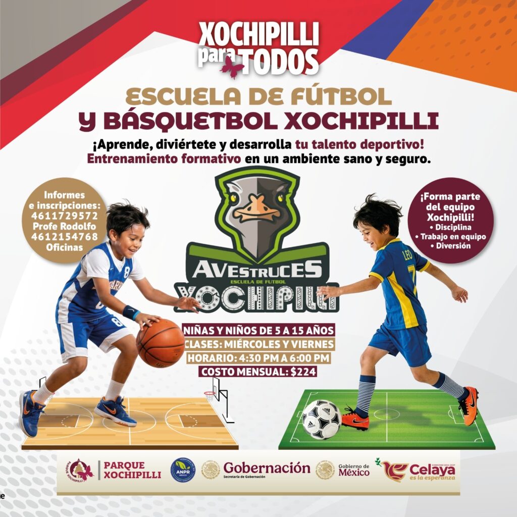 Celaya, Gto., a 02 de marzo del 2026.- La Escuela de fútbol y básquetbol del Parque Xochipilli mantiene abierta su convocatoria para niñas, niños y adolescentes de 5 a 15 años, consolidándose como una de las principales opciones deportivas formativas en Celaya.