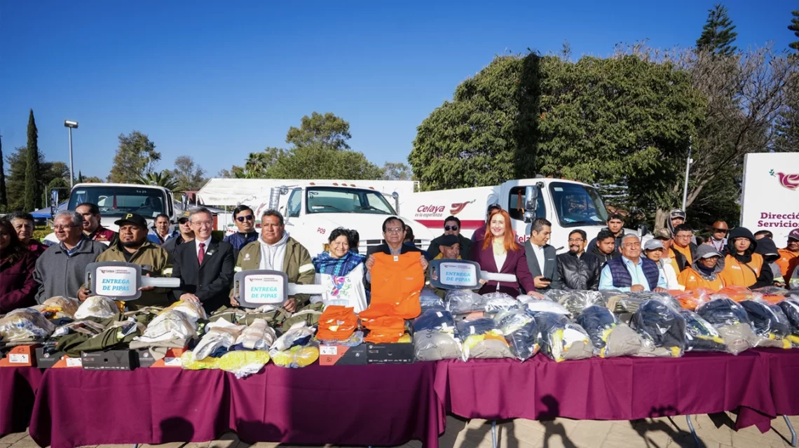 Celaya, Gto., a 24 de febrero del 2026.- Con el objetivo de fortalecer la capacidad operativa y mejorar las condiciones laborales de los empleados municipales, este día el Gobierno Municipal entregó tres pipas, dos nuevas y una rehabilitada, además de uniformes y equipo de protección para el personal de parques y jardines, aseo público, rastro y alumbrado público.