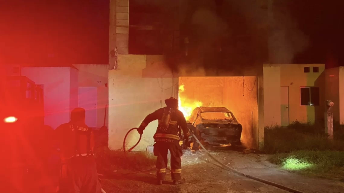 Celaya, Gto., a 09 de octubre del 2025.- Durante la madrugada de este jueves, Protección Civil y Bomberos de Celaya respondieron a un incendio en la cochera de una vivienda, donde un vehículo se encontraba completamente envuelto en llamas.