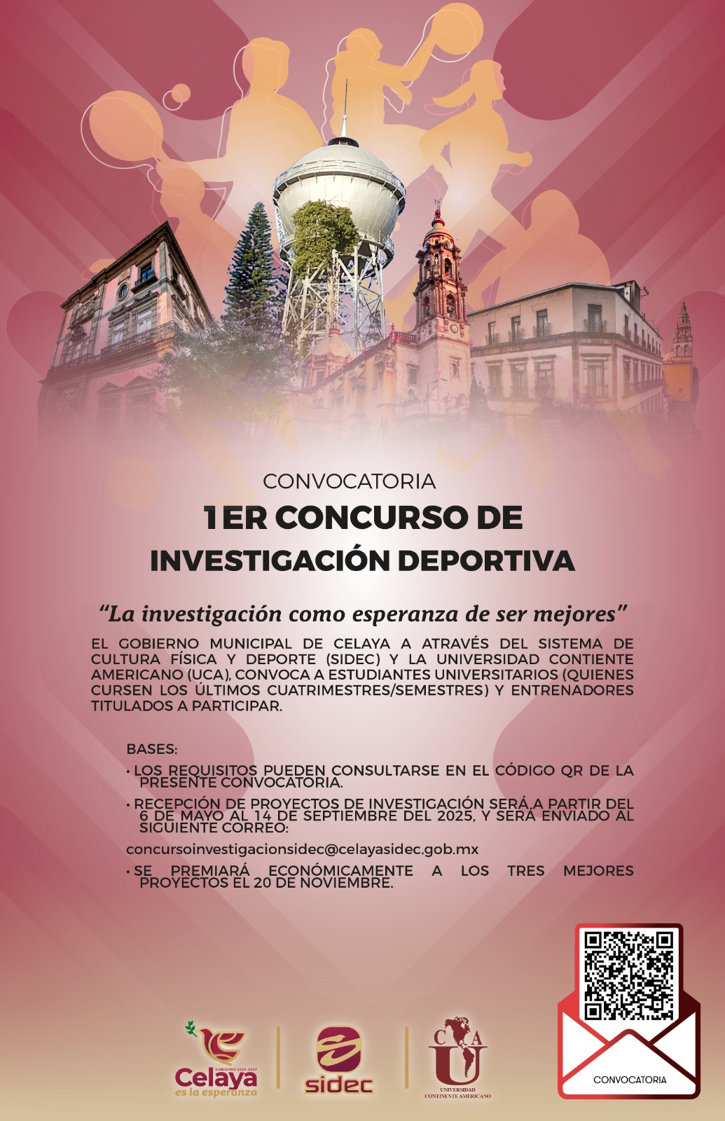 Celaya, Gto., a 21 de mayo del 2025.- El Gobierno Municipal de Celaya, a través del Sistema de Cultura Física y Deporte (SIDEC) y en coordinación con la Universidad Continente Americano (UCA), presentó la convocatoria para el Primer Concurso de Investigación Deportiva “La Investigación como Esperanza de ser Mejores”, con el objetivo de impulsar proyectos innovadores que fomenten el deporte y los hábitos saludables en la sociedad.