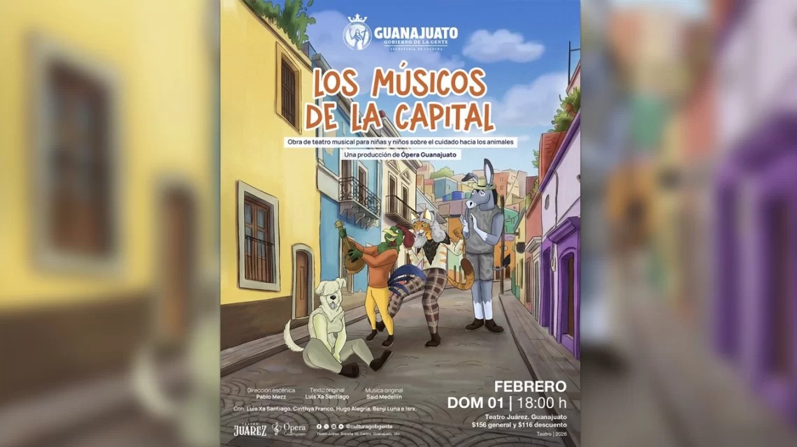 Guanajuato, Gto., a 30 de enero del 2026.- Ópera Guanajuato presenta Los Músicos de la Capital, un espectáculo escénico de teatro musical infantil dirigido a niñas y niños de 5 a 10 años, que busca promover la empatía, la educación emocional y el respeto hacia los animales mediante una propuesta artística interdisciplinaria.