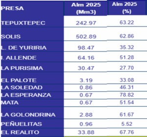 Respecto a las principales presas de la entidad, estas presentan un nivel promedio de almacenamiento del 55.1%, lo que representa 982.1 millones de metros cúbicos de agua.