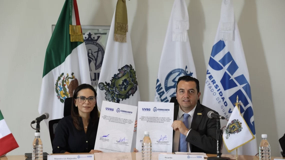 Guanajuato, Gto., a 03 de diciembre del 2025.- La Universidad Virtual del Estado de Guanajuato (UVEG) y la Secretaría de Derechos Humanos del Estado de Guanajuato formalizaron un convenio de colaboración orientado a impulsar acciones de capacitación, inclusión social y desarrollo comunitario, con el fin de mejorar el bienestar y la calidad de vida de diversos sectores de la población.