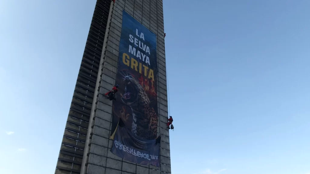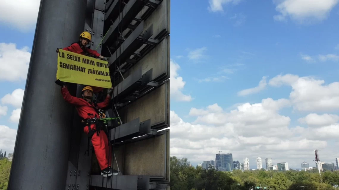 Ciudad de México, a 23 de septiembre del 2025.- Un grupo de activistas de Greenpeace México escaló este martes la Estela de Luz, en Paseo de la Reforma, para demandar acciones inmediatas que frenen la deforestación en la Selva Maya, uno de los ecosistemas más importantes de América Latina.