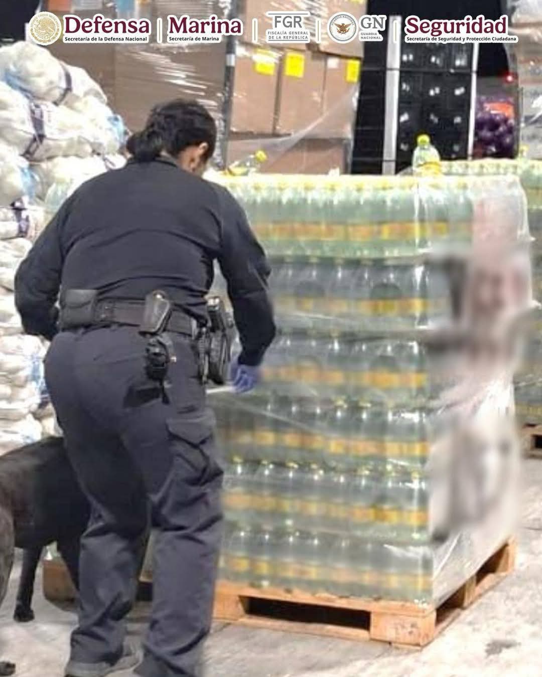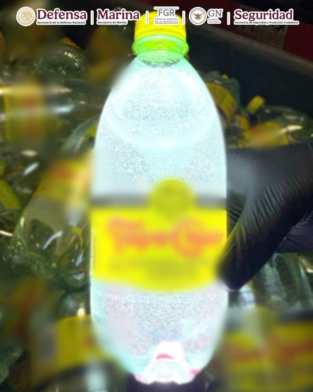 Durante la inspección de un tractocamión con caja refrigerada que transportaba productos como chiles, papas y cebollas, las autoridades detectaron irregularidades en 1,632 botellas de agua mineral, las cuales no contenían gas. Tras un análisis con equipo especializado de la Oficina de Aduanas y Protección Fronteriza (CBP, por sus siglas en inglés), se confirmó que el líquido dentro de las botellas era metanfetamina, con un peso total de 1,028.98 kilogramos.