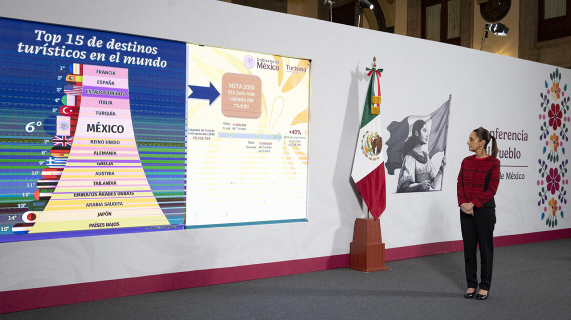 Ciudad de México, a 13 de junio del 2025.- La presidenta Claudia Sheinbaum Pardo presentó este viernes los objetivos del Plan México, que contempla colocar al país como el quinto más visitado del mundo para el año 2030, lo que implicaría un incremento del 40 por ciento en la afluencia turística internacional.