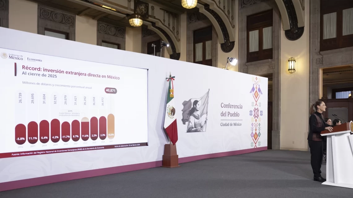 Ciudad de México a 26 de febrero del 2026.- La Presidenta Claudia Sheinbaum Pardo informó que México alcanzó un récord histórico en Inversión Extranjera Directa (IED) en 2025, al recibir 40,871 millones de dólares, lo que representa un aumento de 10.8% respecto a 2024. Esta cifra marca el nivel más alto registrado en un solo año, reflejando la confianza de los inversionistas y la efectividad del modelo económico de la Cuarta Transformación.