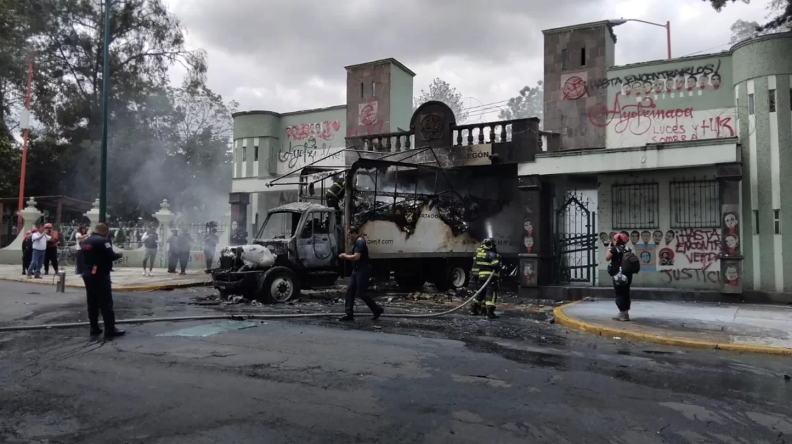 En la alcaldía Miguel Hidalgo, un grupo de manifestantes encapuchados derribó la puerta del Campo Militar 1-A con un camión de mercancías, que posteriormente incendiaron frente a las instalaciones. Aunque no se reportaron personas lesionadas, este acto simboliza la frustración de los familiares por la falta de transparencia y resultados en la investigación.