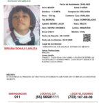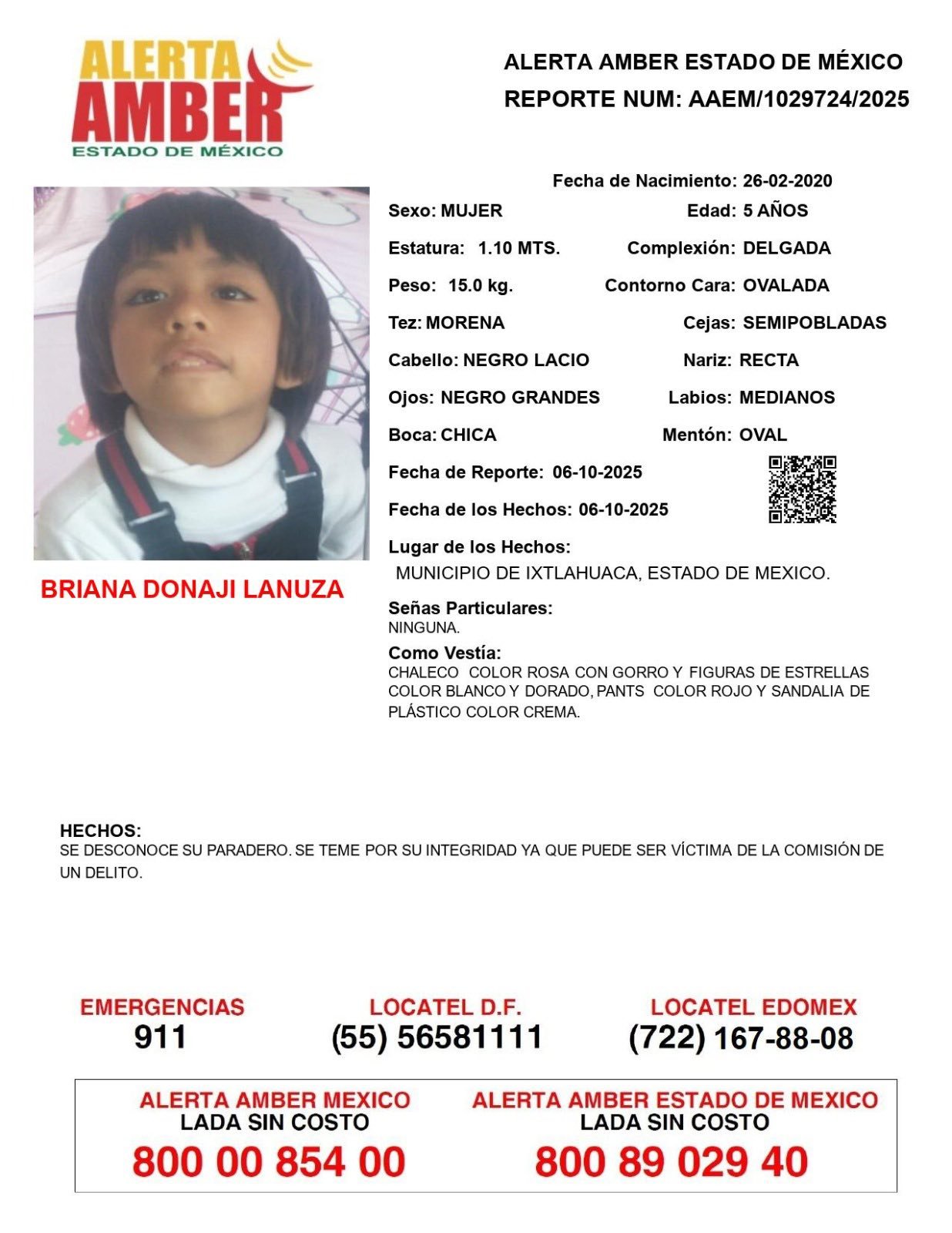 - Briana Donají Lanuza: niña de 5 años, complexión delgada, cabello negro lacio, vestía chaleco rosa con gorro, pants rojo y sandalias crema.