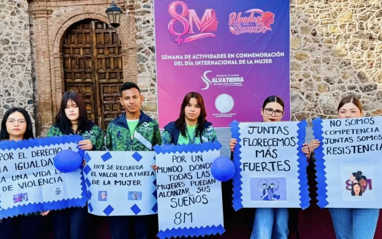 En Salvatierra, mujeres y hombres participaron en una caminata por el Día Internacional de la Mujer, con pancartas de apoyo y una clase de defensa personal al final del recorrido.