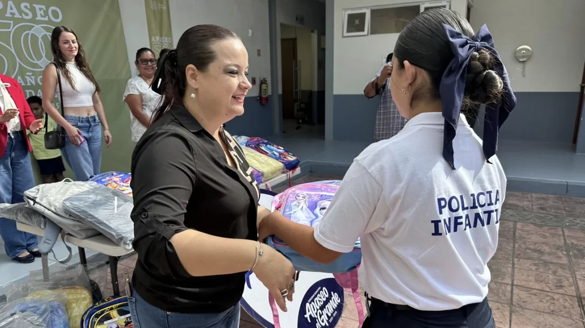 Tras recibir sus mochilas y útiles, los estudiantes de la Academia Policial Infantil acompañaron a las autoridades para entregar los materiales a más niñas y niños en las comunidades de Los Rangel, El Sifón, Minitas, San Ignacio y El Tesoro, beneficiando así a un total de 254 menores del municipio.