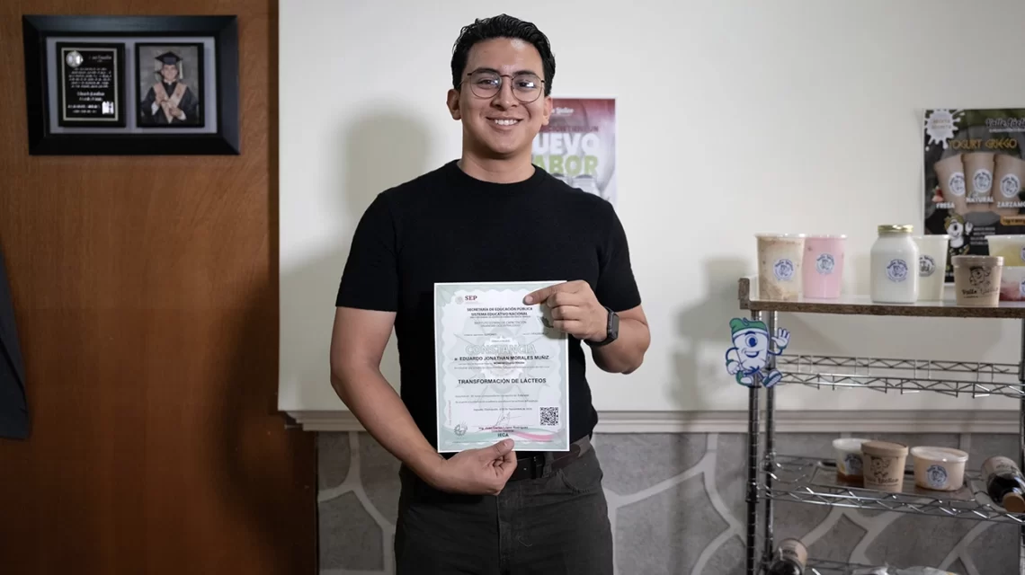 Valle de Santiago, Gto., a 13 de diciembre del 2025.- Eduardo Morales Muñiz, ingeniero químico de formación, convirtió su pasión por los lácteos en un proyecto exitoso gracias al Instituto Estatal de Capacitación (IECA). A través del curso Transformación de Lácteos, Eduardo fortaleció su emprendimiento Valle Láctico, una marca dedicada a la elaboración artesanal de yogurt con altos estándares de calidad.