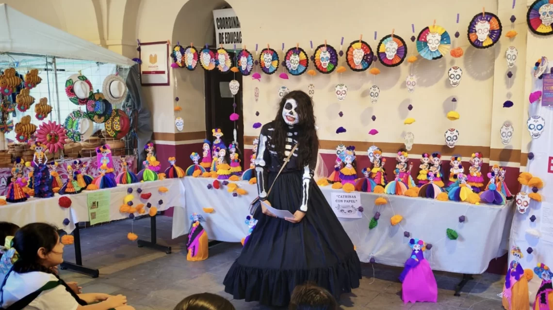 El evento incluyó un entremés cultural a cargo de la bachiller Isis Estephany Domínguez Blas, quien, caracterizada como catrina, interpretó en náhuatl la canción La Llorona y compartió la lectura del cuento La calavera cantante, escrito por su madre, Mariana Blas Sotelo, en una emotiva muestra de arte y tradición familiar.