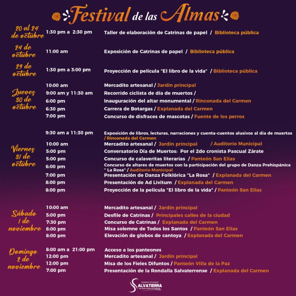Salvatierra, Gto., a 22 de octubre del 2025.- Con el objetivo de preservar y difundir las tradiciones del Día de Muertos, el Gobierno Municipal de Salvatierra organiza el Festival de las Almas 2025, que se desarrollará del 24 de octubre al 2 de noviembre en diversos espacios públicos de la ciudad.