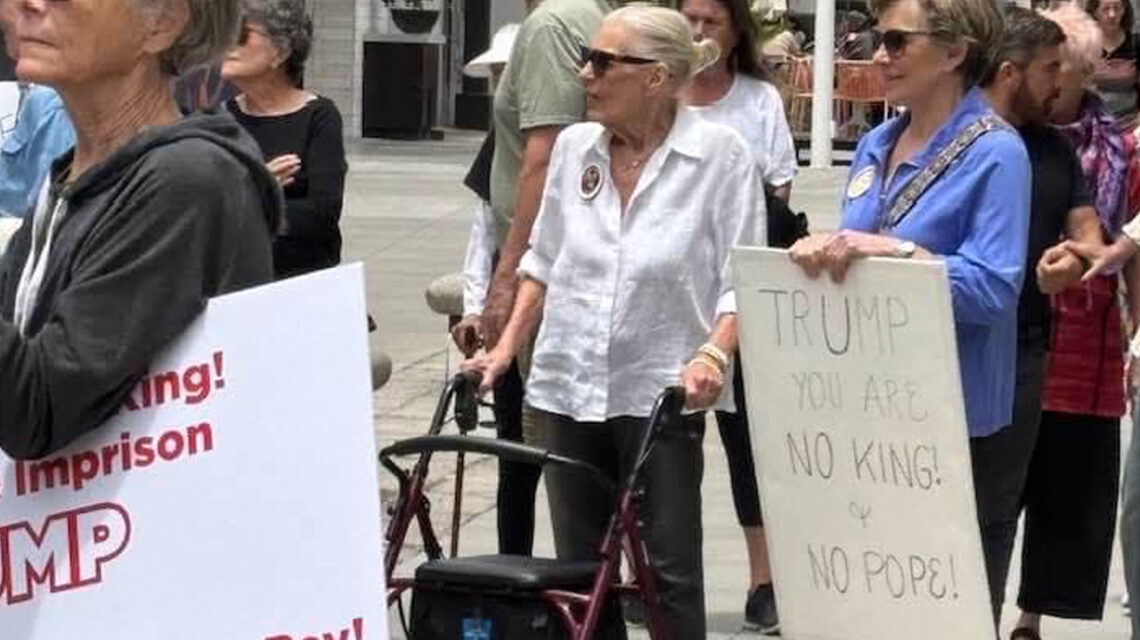 San Miguel de Allende, Gto., a 14 de junio del 2025.- La mañana del sábado 14 de junio, decenas de ciudadanos estadounidenses residentes en San Miguel de Allende se concentraron frente a la Agencia Consular de Estados Unidos para sumarse a la protesta global denominada “No Kings”, en rechazo a las políticas migratorias y discursos de odio impulsados por el expresidente Donald Trump y su círculo cercano.