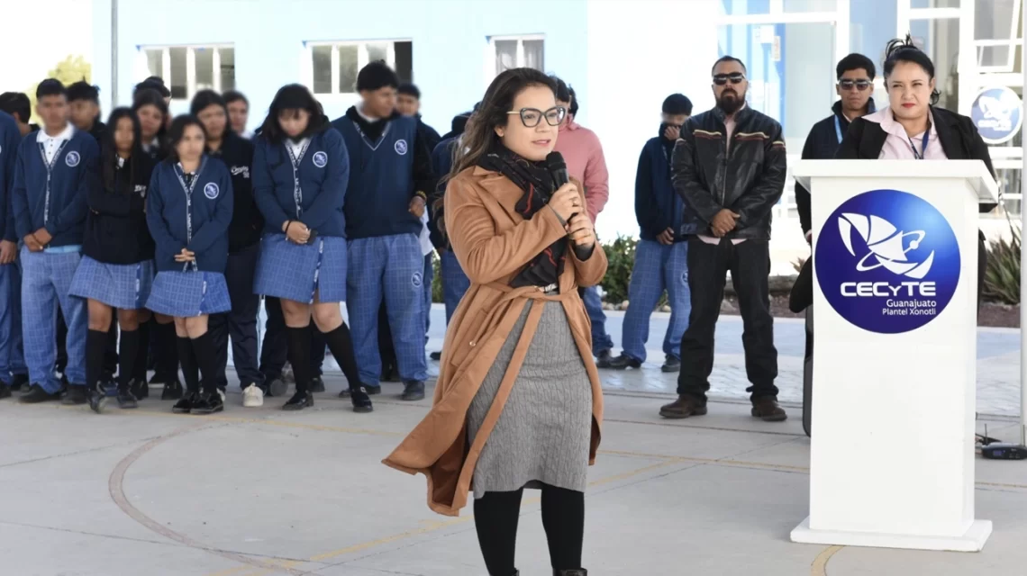 Villagrán, Gto., a 10 de noviembre del 2025.- La presidenta municipal de Villagrán, Cinthia Teniente Mendoza, realizó esta mañana una visita al plantel CECyTE Xonotli, donde compartió con estudiantes, docentes y personal administrativo. Durante su recorrido, participó en los honores a la Bandera Nacional, acompañada de la secretaria del Ayuntamiento, Jazmín Carmona Cornejo, así como de directores de diversas áreas municipales.