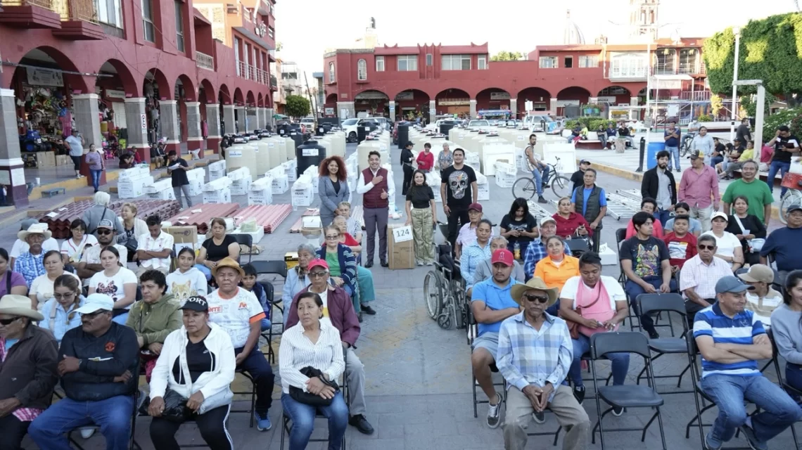 La entrega se llevó a cabo en el jardín principal, beneficiando a cerca de 150 familias, quienes recibieron productos como tinacos, cisternas, calentadores solares, sanitarios, pintura, impermeabilizantes, láminas para tejados, carretillas y diversas herramientas.