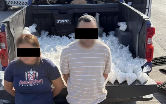 Autoridades estatales y federales aseguraron 75 kilos de presunta metanfetamina en la carretera 45-D, tramo Salamanca–Celaya. Dos personas fueron detenidas y puestas a disposición federal.
