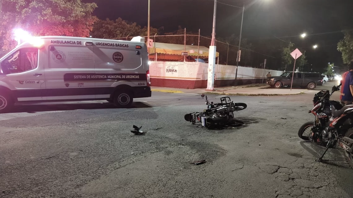 Celaya, Gto., a 29 de agosto del 2025.- La noche del viernes se registró un accidente entre dos motocicletas en la colonia San Juanico, en el cruce de la avenida El Sauz con avenida Esmeralda.