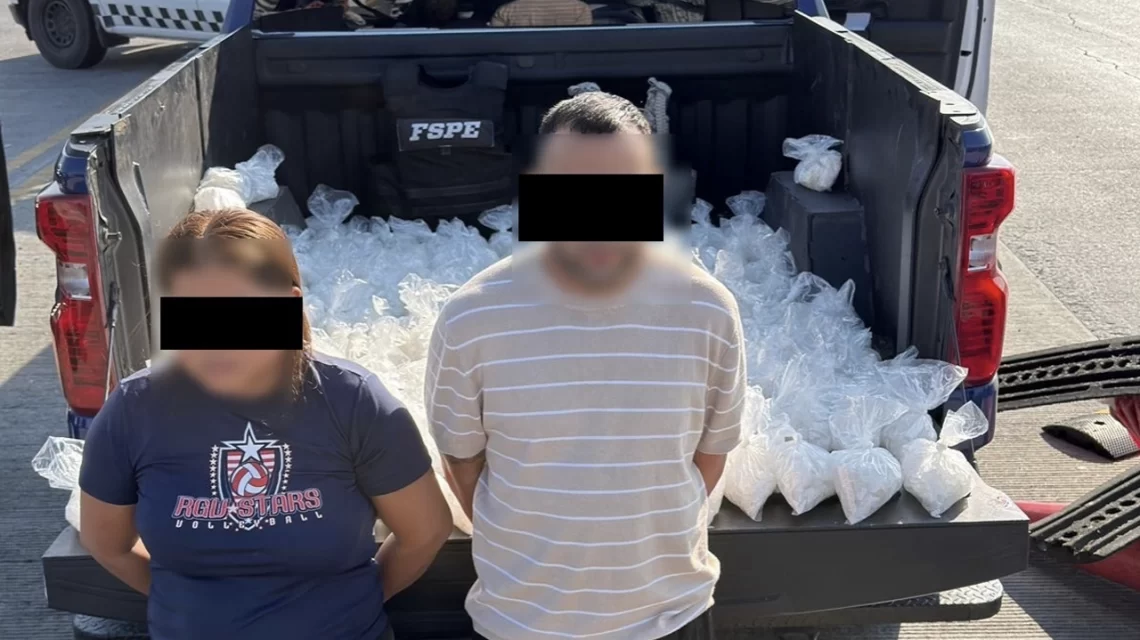 Durante la inspección, los oficiales detectaron irregularidades que derivaron en una revisión más exhaustiva del vehículo. En el interior localizaron 149 bolsas con sustancia sólida, cristalina y granulada, presuntamente metanfetamina, ocultas en un compartimento alterado.