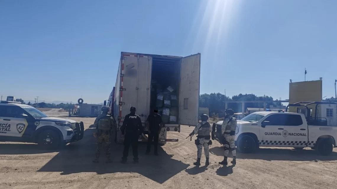 FSPE aseguró un tractocamión con 20 toneladas de mercancía extranjera sin documentación legal en San Diego de la Unión. El conductor y la carga fueron turnados a la FGR para continuar con las investigaciones.