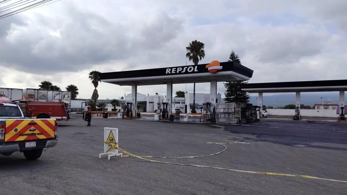Alrededor de las 9:30 horas, un camión tipo torton volcó mientras realizaba maniobras de descarga en una estación de servicio Repsol, ubicada a un costado de la carretera Panamericana, tramo Celaya-Salamanca. El vehículo derramó combustible, por lo que la zona fue evacuada y acordonada por elementos de Protección Civil y Bomberos.