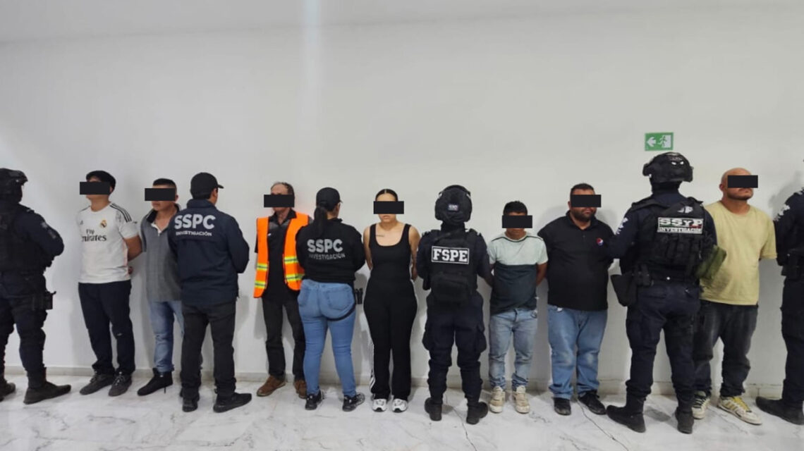 Durante el operativo fueron aseguradas ocho personas: siete hombres y una mujer, identificados como José Guadalupe “N” (75 años), José Efrén “N” (42), María Carolina “N” (27), Luis Kaleb “N” (20), Jesús Salvador “N” (32), Miguel “N” (35), Héctor Vladimir “N” (34) y Tirso “N” (74).