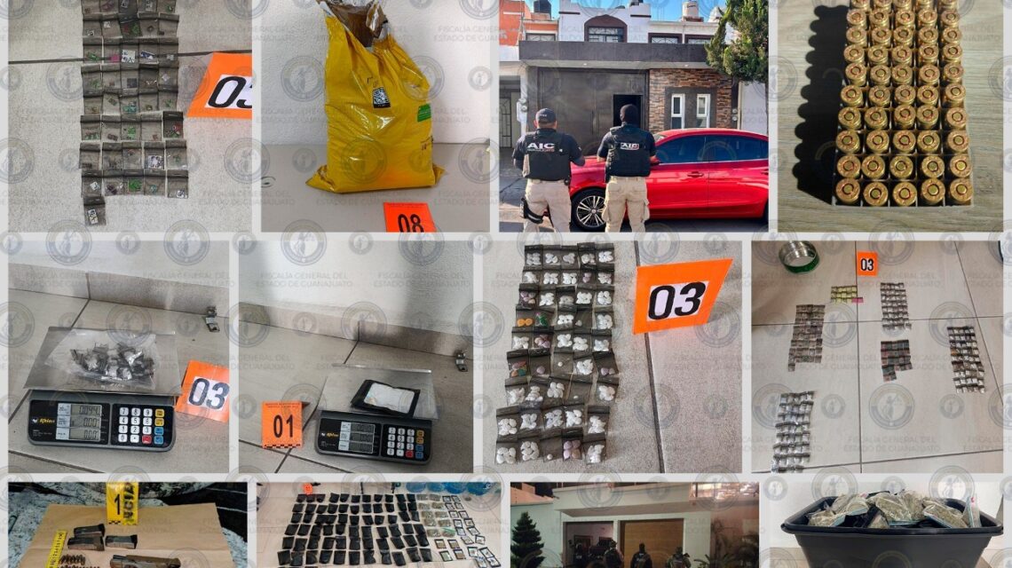 León, Gto., a 17 de abril del 2026.- La Fiscalía General del Estado de Guanajuato (FGE) realizó dos cateos en León como parte de operativos enfocados al combate a la delincuencia, logrando la detención de seis personas y el aseguramiento de armas, sustancias ilícitas y diversos objetos.