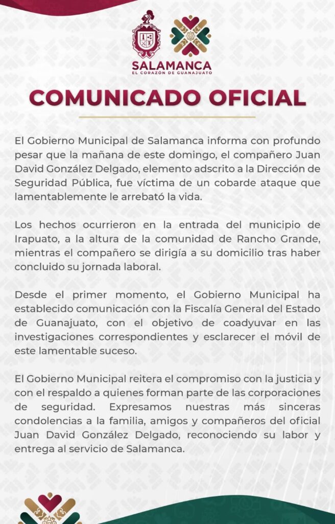 El Gobierno Municipal de Salamanca expresó su pesar y aseguró que mantiene comunicación con la Fiscalía para coadyuvar en las pesquisas. En su comunicado oficial, el Ayuntamiento reiteró su respaldo a los integrantes de las corporaciones de seguridad y expresó condolencias a la familia, amigos y compañeros del comandante, reconociendo su dedicación y compromiso al servicio de la ciudadanía.