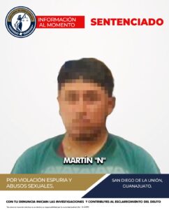 San Diego de la Unión, Gto., a 20 de agosto del 2025.- La Fiscalía General del Estado logró que un tribunal impusiera una sentencia de 13 años y siete meses de prisión a MARTÍN “N”, tras comprobar su responsabilidad en los delitos de violación espuria y abusos sexuales en agravio de una víctima.