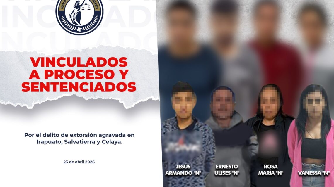 Guanajuato, Gto., a 23 de abril del 2026.- La Fiscalía General del Estado de Guanajuato (FGE) informó la obtención de sentencias condenatorias y vinculaciones a proceso contra integrantes de una estructura criminal dedicada a la extorsión agravada, la cual operaba en distintos municipios de la entidad.
