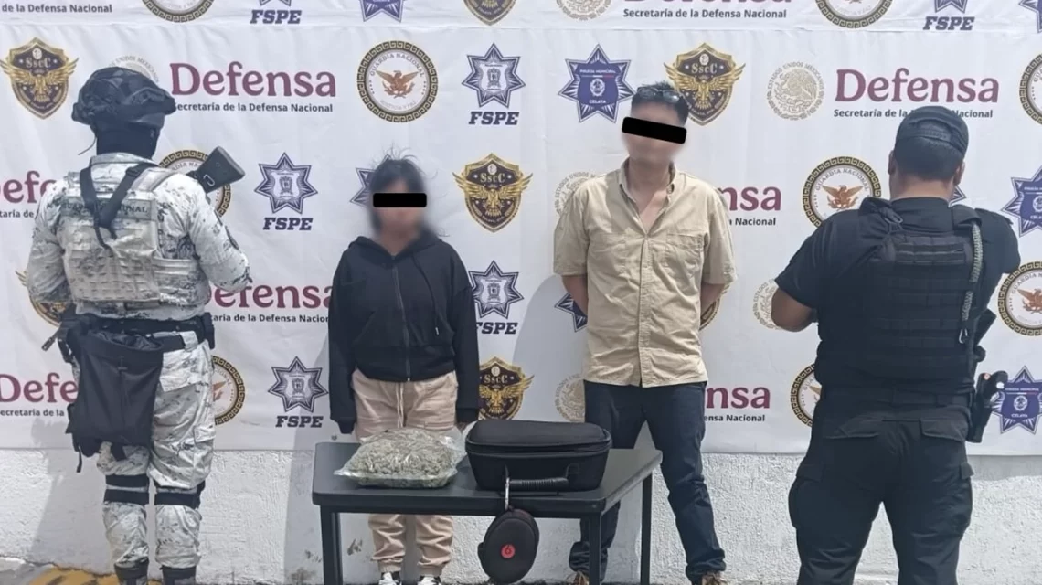 Un hombre y una mujer fueron detenidos en Celaya con aproximadamente un kilo de presunta marihuana y un vehículo robado, tras una persecución en la colonia Rancho Seco.