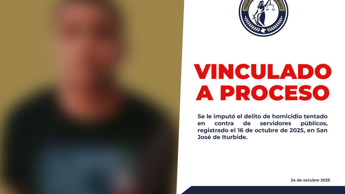 San José Iturbide, Gto., a 24 de octubre del 2025.- La Fiscalía General del Estado de Guanajuato (FGE) informó la detención y vinculación a proceso de Jonathan Alejandro “N”, señalado por atacar con disparos de arma de fuego a agentes de investigación criminal y a un agente del Ministerio Público mientras cumplían con una orden judicial.