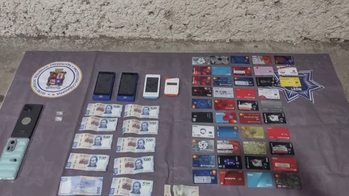 Durante la revisión, se les aseguraron 43 tarjetas bancarias, más de 5 mil pesos en efectivo, cuatro terminales bancarias, dos teléfonos celulares y dos envoltorios de cristal, lo que refuerza la línea de investigación por posibles delitos relacionados con fraude y clonación de tarjetas.