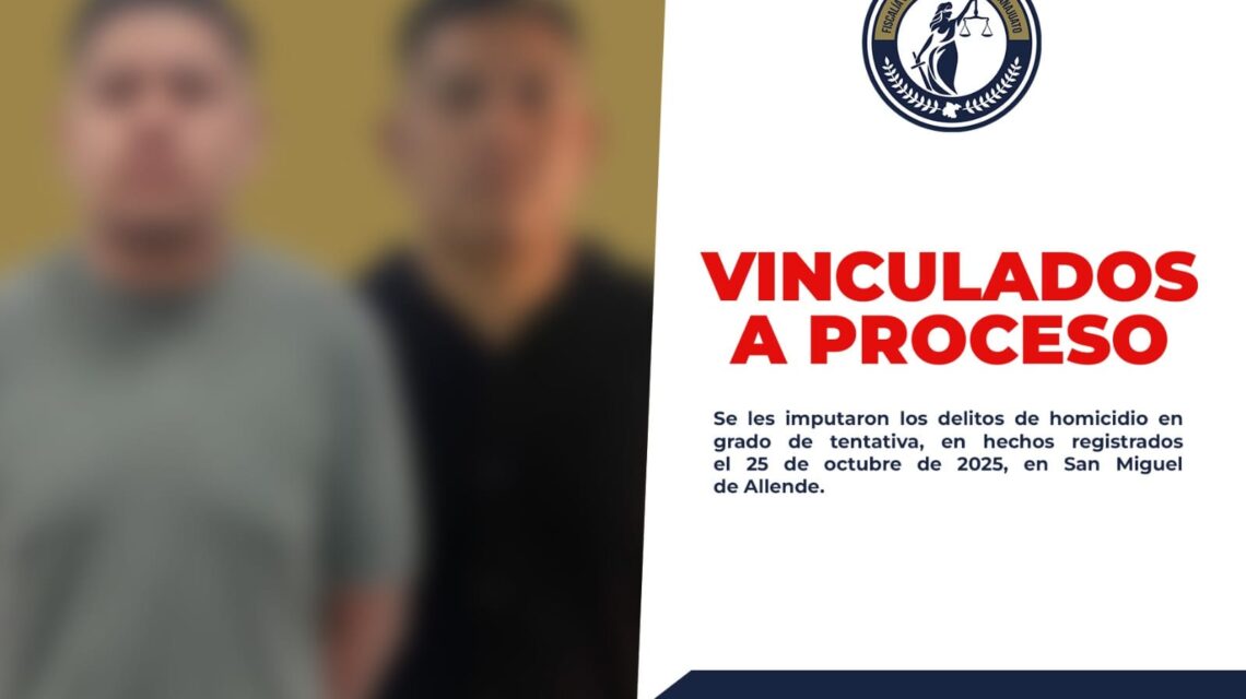 San Miguel de Allende, Gto., a 05 de noviembre del 2025.- La Fiscalía General del Estado informó que un juez vinculó a proceso penal a Carlos Ernesto “N”, alias ‘Tanque’, y Juan Antonio “N”, alias ‘Camaney’, por su probable participación en un homicidio en grado de tentativa.