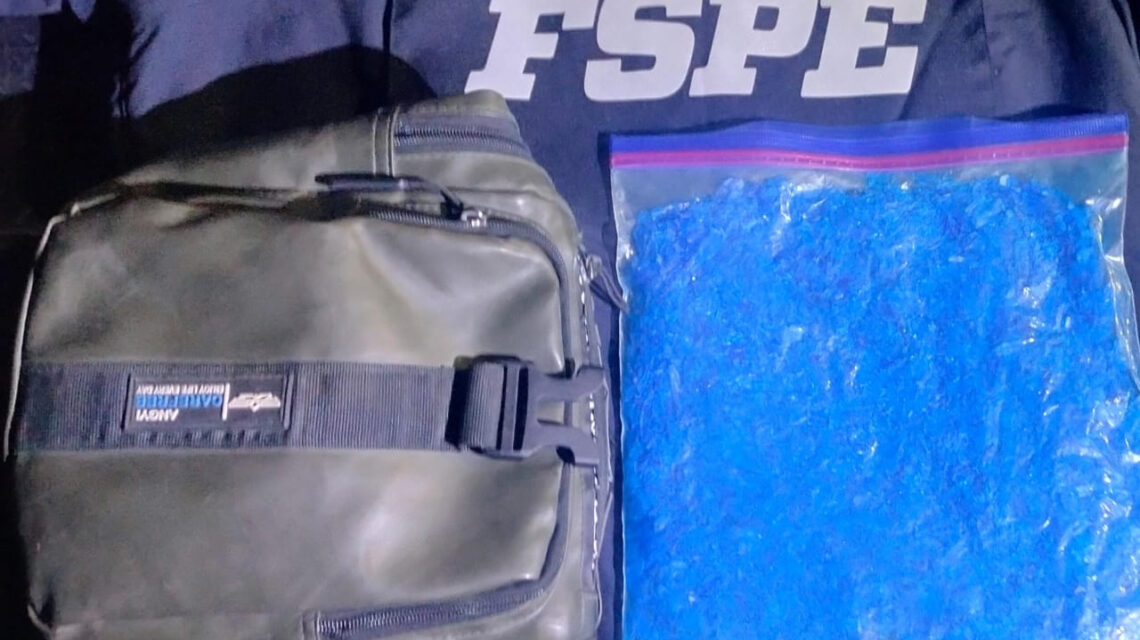Durante el recorrido, los oficiales detectaron a un hombre con ropa camuflaje, quien al notar la presencia policial huyó hacia un cerro cercano. Tras una inspección en la zona, el personal localizó una mochila verde tipo militar oculta entre las piedras. En su interior se halló una bolsa con una sustancia granulada de color azul, presuntamente cristal, con un peso aproximado de 504 gramos.