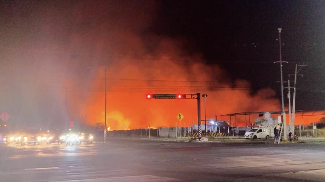 Celaya, Gto., a 09 de marzo del 2026.- La noche del lunes se registró un incendio de gran intensidad en el sur de la ciudad, en la intersección de la Avenida Lázaro Cárdenas con el Eje Juan Pablo II, cerca de la distribuidora Gas Noel. El siniestro provocó preocupación entre vecinos y conductores debido a su cercanía con instalaciones de gas.