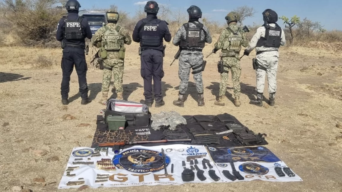 Santa Cruz de Juventino Rosas, Gto., a 11 de marzo del 2026.- En un operativo coordinado, el Grupo Táctico Regional de las Fuerzas de Seguridad Pública del Estado (FSPE), en conjunto con el Ejército Mexicano y la Guardia Nacional, aseguró armamento, municiones y equipo táctico en la zona rural de Juventino Rosas.