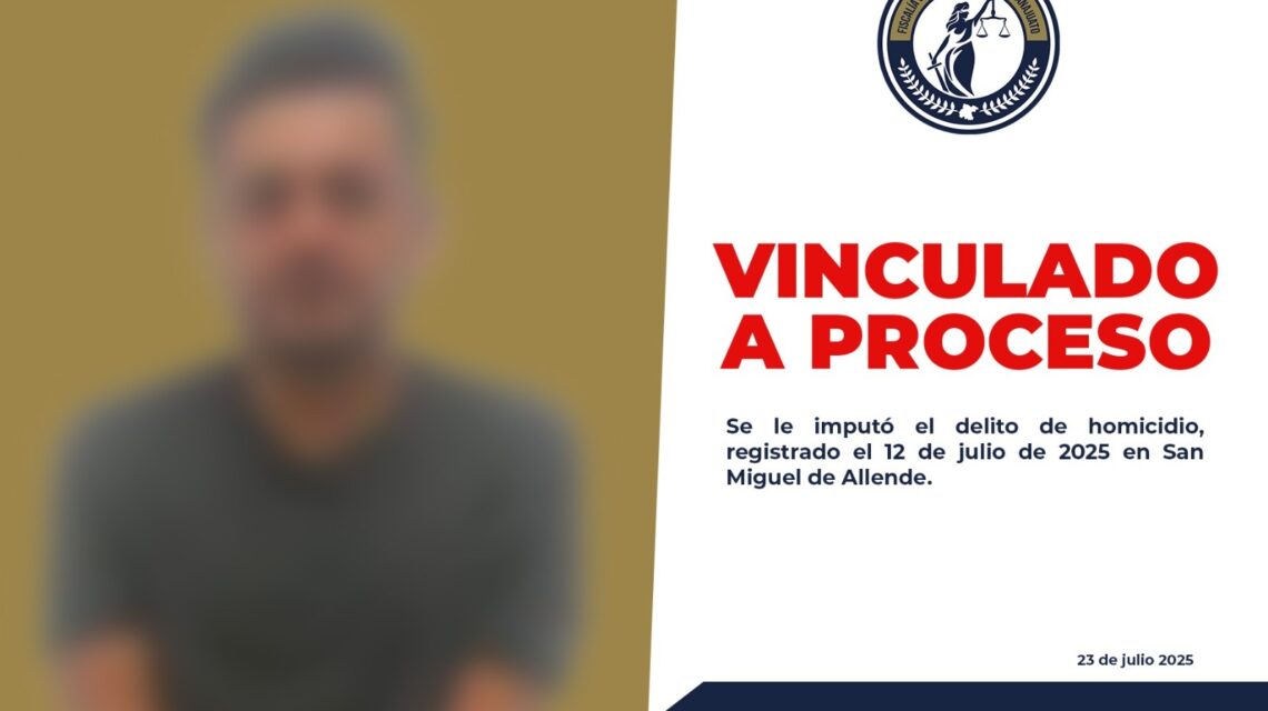San Miguel de Allende, Gto., a 23 de julio del 2025.- La Fiscalía General del Estado de Guanajuato informó que fue vinculado a proceso penal Benjamín “N”, por su probable responsabilidad en el delito de homicidio calificado, ocurrido el pasado 12 de julio en este municipio.