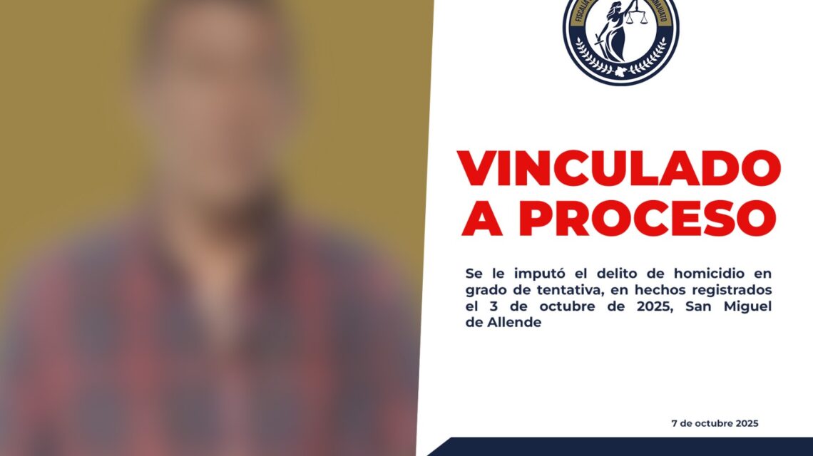 San Miguel de Allende, Gto., a 07 de octubre del 2025.- La Fiscalía General del Estado de Guanajuato (FGE) obtuvo la vinculación a proceso de Epifanio “N”, acusado de intentar asesinar a un hombre durante un ataque ocurrido el pasado 3 de octubre de 2025 en pleno centro histórico del municipio.