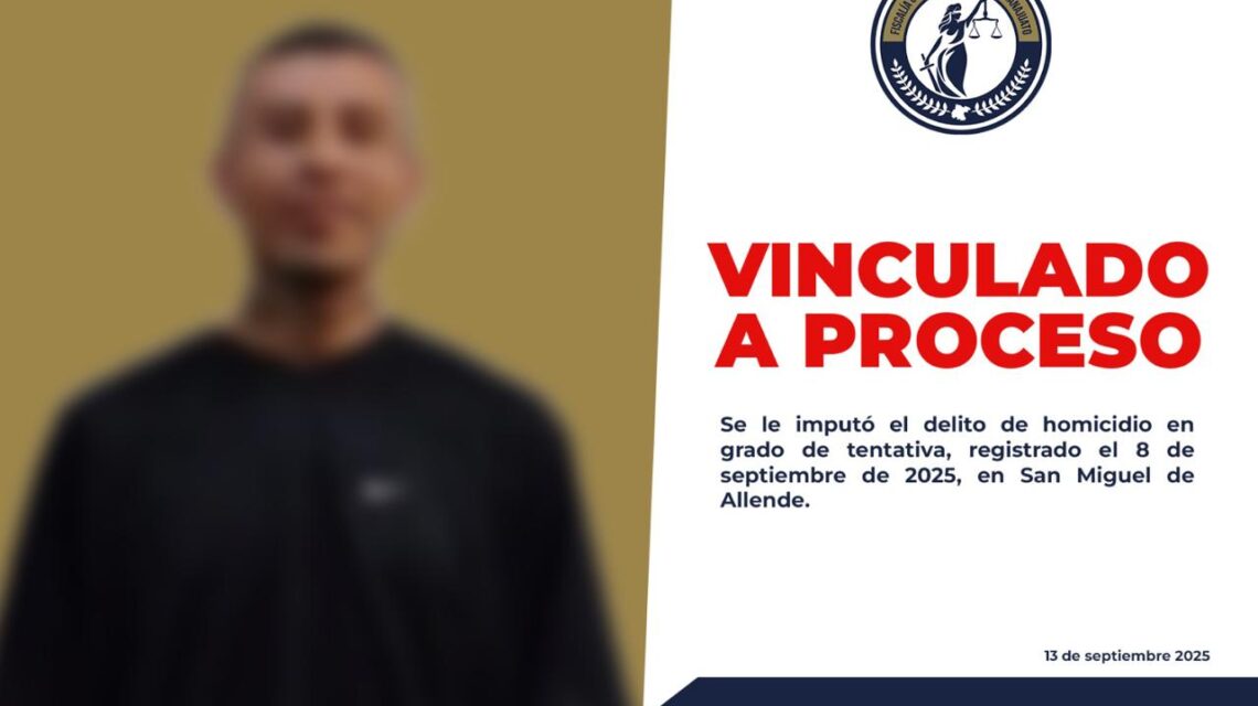 San Miguel de Allende, Gto., a 13 de septiembre del 2025.- La Fiscalía General del Estado de Guanajuato informó que Luis Alberto “N”, alias “El Luisote”, fue vinculado a proceso y permanecerá en prisión preventiva justificada, acusado de homicidio en grado de tentativa en agravio de un adolescente y su abuela en la colonia Nuevo Pantoja.