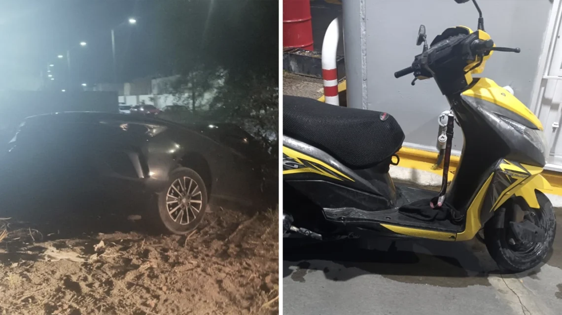 El primer caso se registró luego de una llamada que alertó sobre un accidente vehicular en la colonia Sienna Residencial. Al arribar al sitio, los oficiales ubicaron un automóvil MG5 modelo 2026, color negro, que se encontraba al interior de una zanja en un terreno de cultivo.