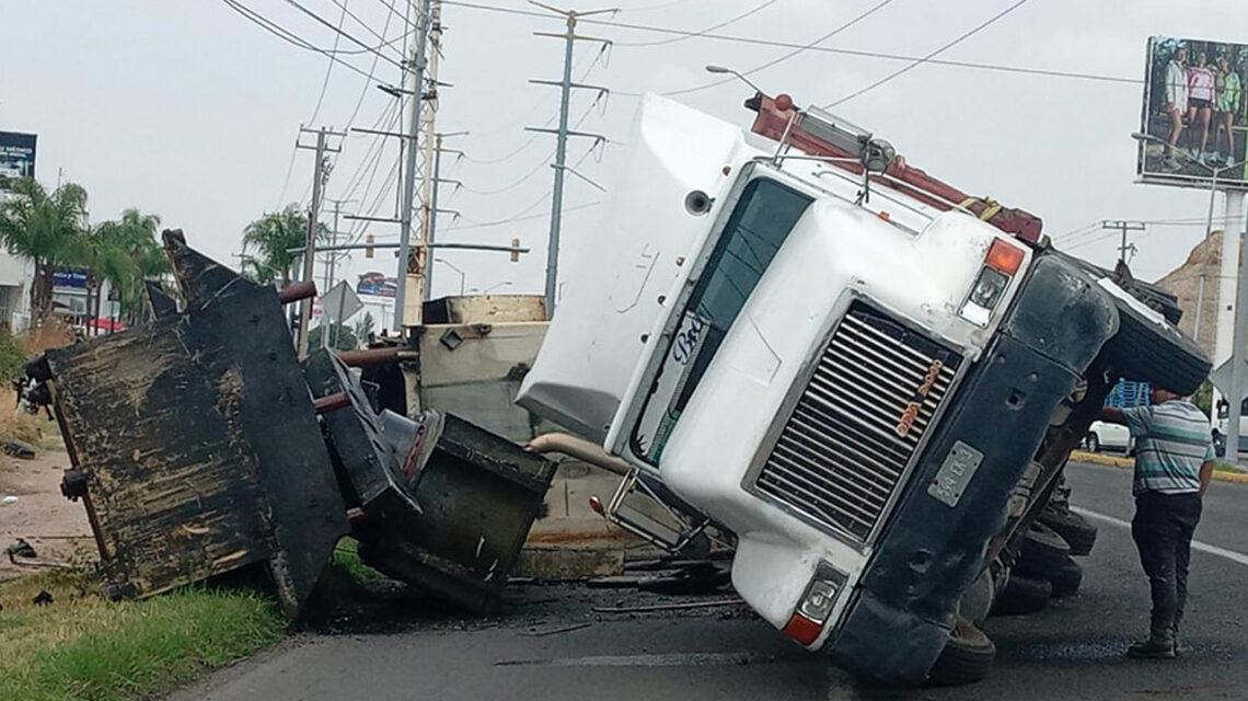 Celaya, Gto.,a 02 de junio del 2025.- Un tráiler de plataforma volcó la mañana de este lunes sobre el Eje Norponiente, en Celaya, provocando el cierre parcial de la vialidad y afectaciones significativas al tránsito vehicular. El percance ocurrió a la altura del hospital San José, sin que se reportaran personas lesionadas.