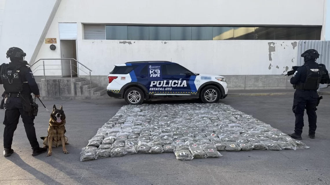 León, Gto., a 17 de diciembre del 2025.- Un cargamento de 162 kilogramos de presunta marihuana fue asegurado por elementos de las Fuerzas de Seguridad Pública del Estado (FSPE), con apoyo de la Unidad Canina K9, durante un operativo realizado en una empresa de mensajería ubicada en el municipio de León, Guanajuato.