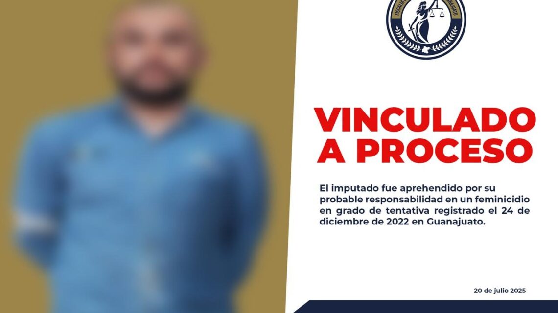 Guanajuato, Gto., a 20 de julio del 2025.- La Fiscalía General del Estado de Guanajuato informó que, como resultado de las investigaciones realizadas por personal ministerial, pericial y policial, se logró la vinculación a proceso penal de Andrés Salvador “N” por su probable responsabilidad en el delito de feminicidio en grado de tentativa, en agravio de una mujer con quien mantenía una relación sentimental.