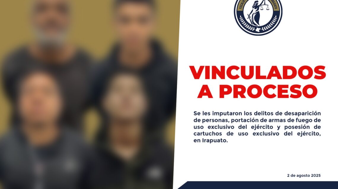 Irapuato, Gto., a 02 de agosto del 2025.- La Fiscalía General del Estado de Guanajuato logró que cuatro hombres fueran vinculados a proceso penal luego de ser detenidos el pasado 30 de julio de 2025 por elementos de la Secretaría de Seguridad Pública de Irapuato, cuando circulaban a bordo de una camioneta con placas del estado de Michoacán, las cuales estaban relacionadas con actividades delictivas.