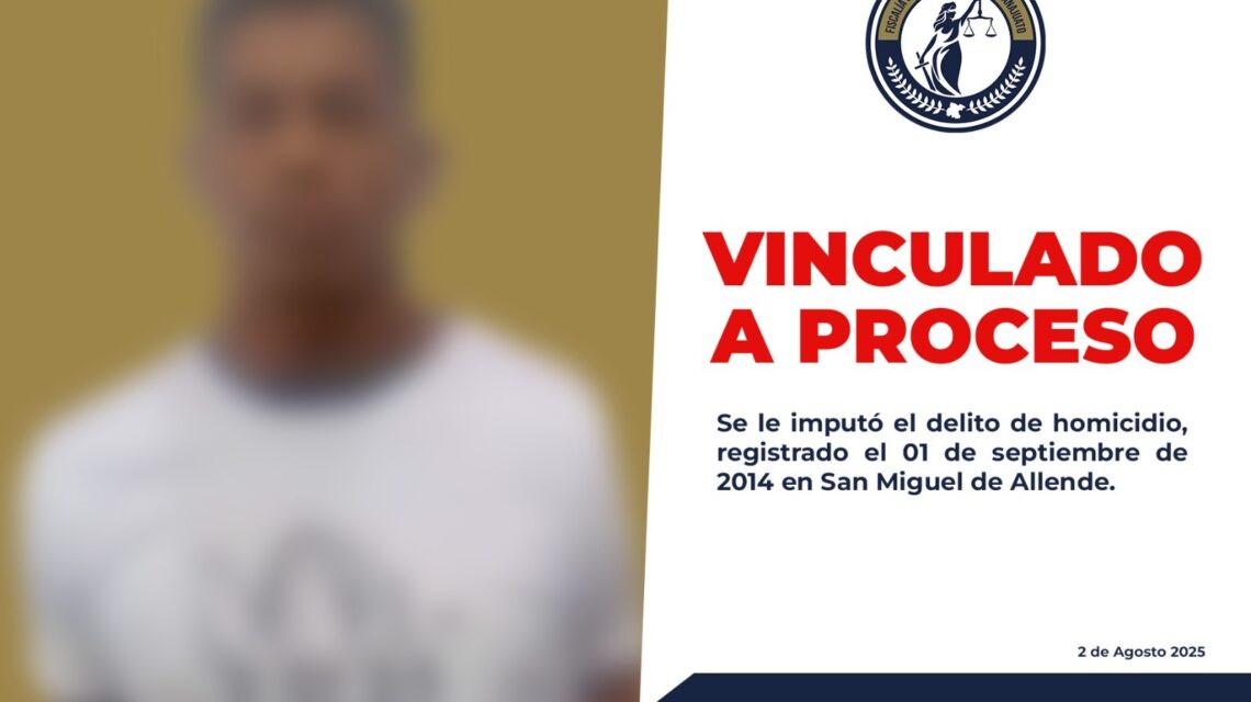 San Miguel de Allende, Gto., a 02 de agosto del 2025.- Christian Alejandro “N”, conocido por los alias de “El Choco”, “El Matehuala” o “El Barbas”, fue vinculado a proceso penal por su presunta responsabilidad en el delito de homicidio, cometido el 1 de septiembre de 2014 en el barrio del Tecolote, en San Miguel de Allende.