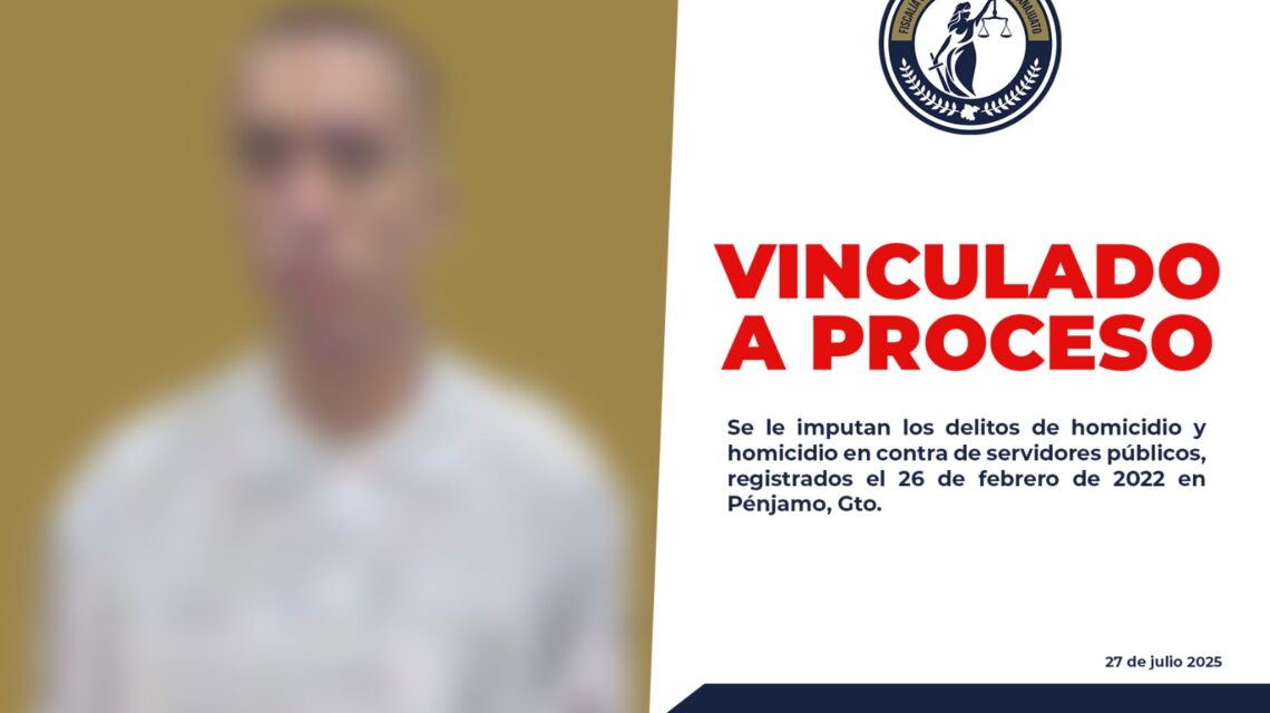 Pénjamo, Gto., a 28 de julio del 2025.- La Fiscalía General del Estado de Guanajuato logró la vinculación a proceso penal de Miguel Ángel “N”, alias “El Nuko”, acusado de cometer dos homicidios, uno de ellos en agravio de un elemento de la Secretaría de Seguridad Pública del municipio de Pénjamo.