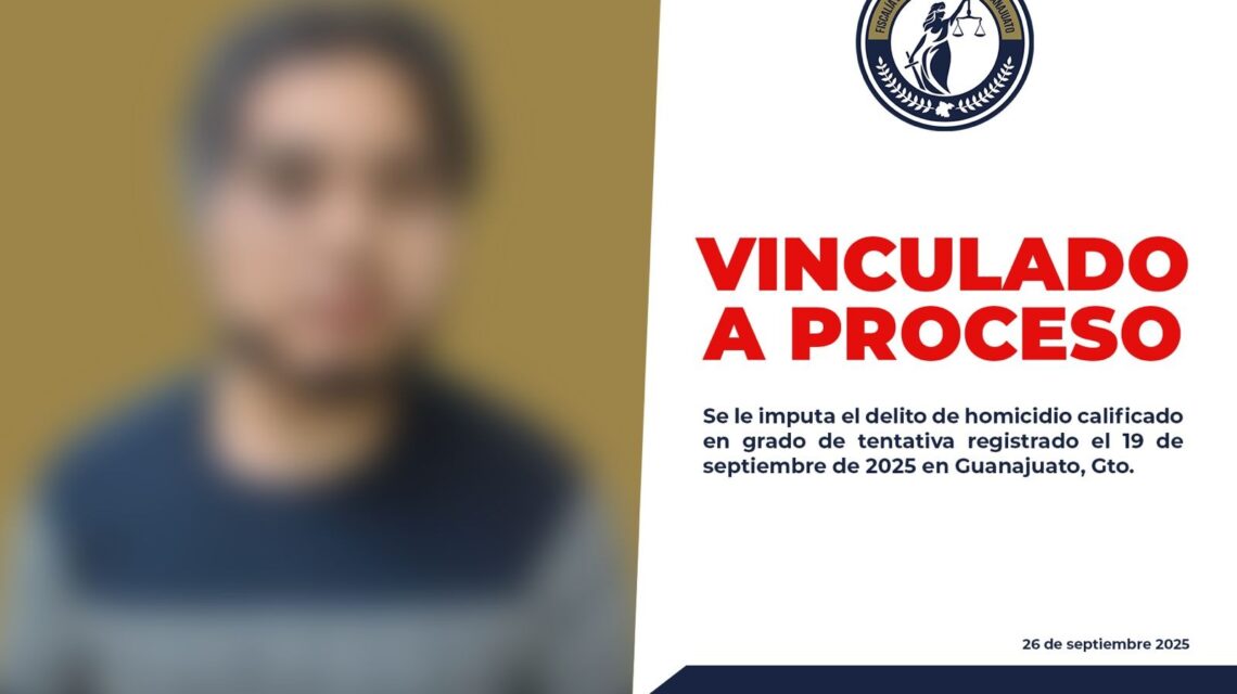 Guanajuato, Gto., a 26 de septiembre del 2025.- La Fiscalía General del Estado (FGE) informó que Emiliano “N” fue vinculado a proceso penal por su presunta participación en el delito de homicidio calificado en grado de tentativa.